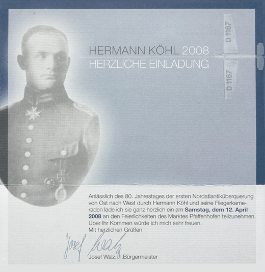 Im Jahre 1928 überflog Hermann Köhl als erster den Atlantik in Ost-West- Richtung, seine Heimatgemeinde Pfaffenhofen im Landkreis Neu-Ulm, nahm dieses Jubiläum zum Anlass den großen Sohn zu ehren.