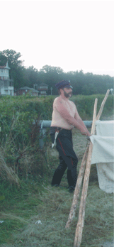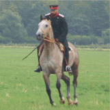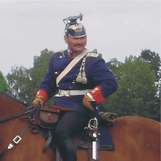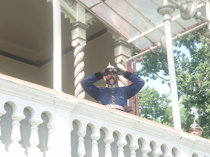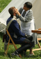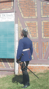 Schlimm genug dass er sein Monokel nicht einkneifen konnte und somit etwas an Wirkung einbüste, so musste er auch noch, nach ärtzlicher Behandlung, eine Augenklappe tragen, die man ihm in der örtlichen Apotheke gab. Weil er als eingeteilter Adjutant auch noch mit einer Aktentasche herum zu laufen hatte und diese ab und an abstellte, hatte er auch noch mit Misstrauen und üblen Scherzen zu kämpfen. Vom „Boxberg-Piraten“ bis zu Vergleichen mit mit einem Oberst einer anderen Epoche musste er sich so einiges anhören. Die Zuschauer dachten wohl es würde sich um eine Marotte handeln - doch die Augenklappe war bitterer Ernst. Nach zwei Tagen war die Entzündung so weit verheilt, dass er endlich wieder seine „Scherbe“ tragen konnte. |