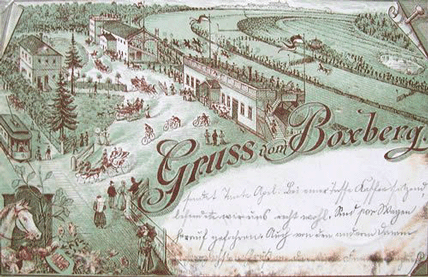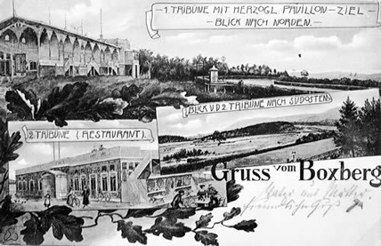 Gefördert vom Herzog von Sachsen-Coburg und Gotha wurde 1878 der Mitteldeutsche Rennverein mit dem Ziel der Errichtung einer Pferderennbahn auf dem 80 Hektar großen Areal gegründet. In den Folgejahren entstand dann die Anlage für ursprünglich Flach- und Hindernisrennen mit einer heute noch erhaltenen, im englischen Stil erbauten Holztribüne und weiteren Wirtschafts- gebäuden. Der Boxberg erlebte seine Blütezeit bis zum Beginn des I. Welt- krieges. |