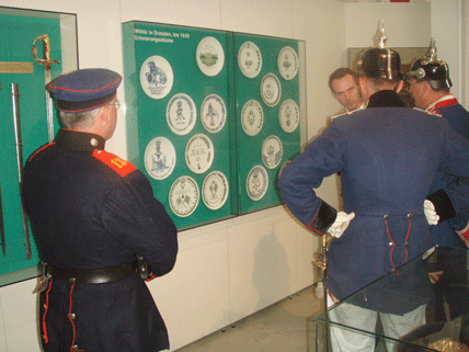 In einer Vitrine im „Garde-Sachsen-Saal“ befinden sich Offiziersgeschenke wie Leuchter, aber auch Helme und Tschapkas, unter anderem vom Königs- Ulanen-Regiment (1. Hannoversches) Nr. 13, Mitbringsel aus der Zeit im Standort Hannover. |