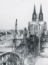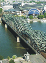 Die Hohenzollernbrücke wurde von 1907 bis 1911 erbaut und bestand ursprünglich aus zwei Eisenbahn- und einer Straßenbrücke, im 2. Weltkrieg zerstört, wurden zuerst nur die beiden Eisenbahnbrücken wieder aufgebaut und später um eine dritte Eisenbahnbrücke ergänzt.